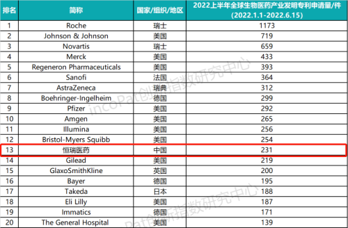 近日,全球专利数据库incoPat创新指数研究中心发布全球生物医药发明专利TOP100榜单,EVO视讯医药以上半年231件发明专利申请量位列榜单第13名,是唯一一家进入TOP20的中国药企。
